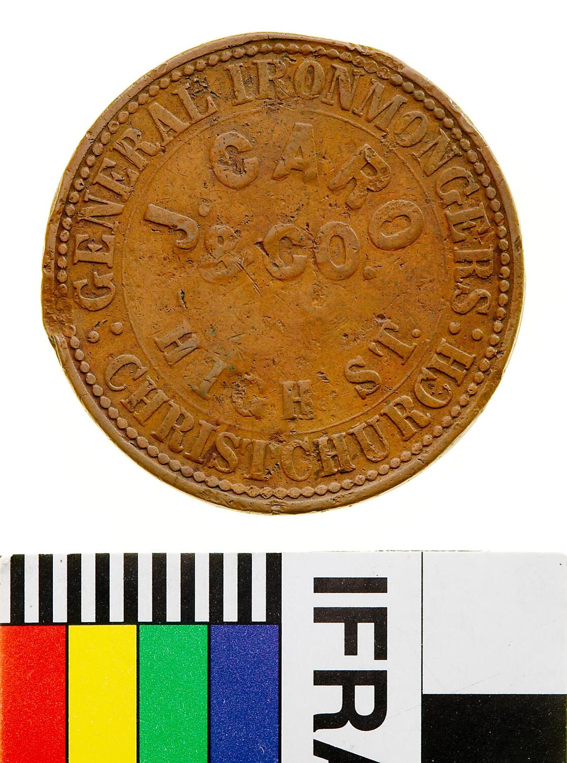 Copper One Penny Token, minted by Stokes, Melbourne. Issued by J. Caro & Co, General Ironmongers, Christchurch, circa 1863. J. Caro & Co was established in 1860 in High Street, Christchurch. The founder, J. Caro, sold it to Solomon Nashelski and his nephew in 1864. The business traded as S&H Nashelski until 1876, when it became S. Nashelski. In 1880 it was sold to Edward E. Ashby and L. Bergh, and it became a limited liability company in 1899. The business was still trading in 1950. In addition to trading as ironmongers, advertisements suggest that, in the late nineteenth century, the company was in the building trade, actually constructing buildings as well as selling the fittings for them.