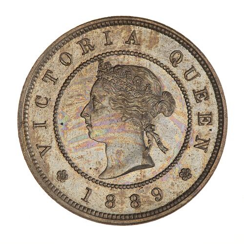 Within a beaded circle, a diademed head of the Queen facing left; around, VICTORIA QUEEN; below between two roses, 1889