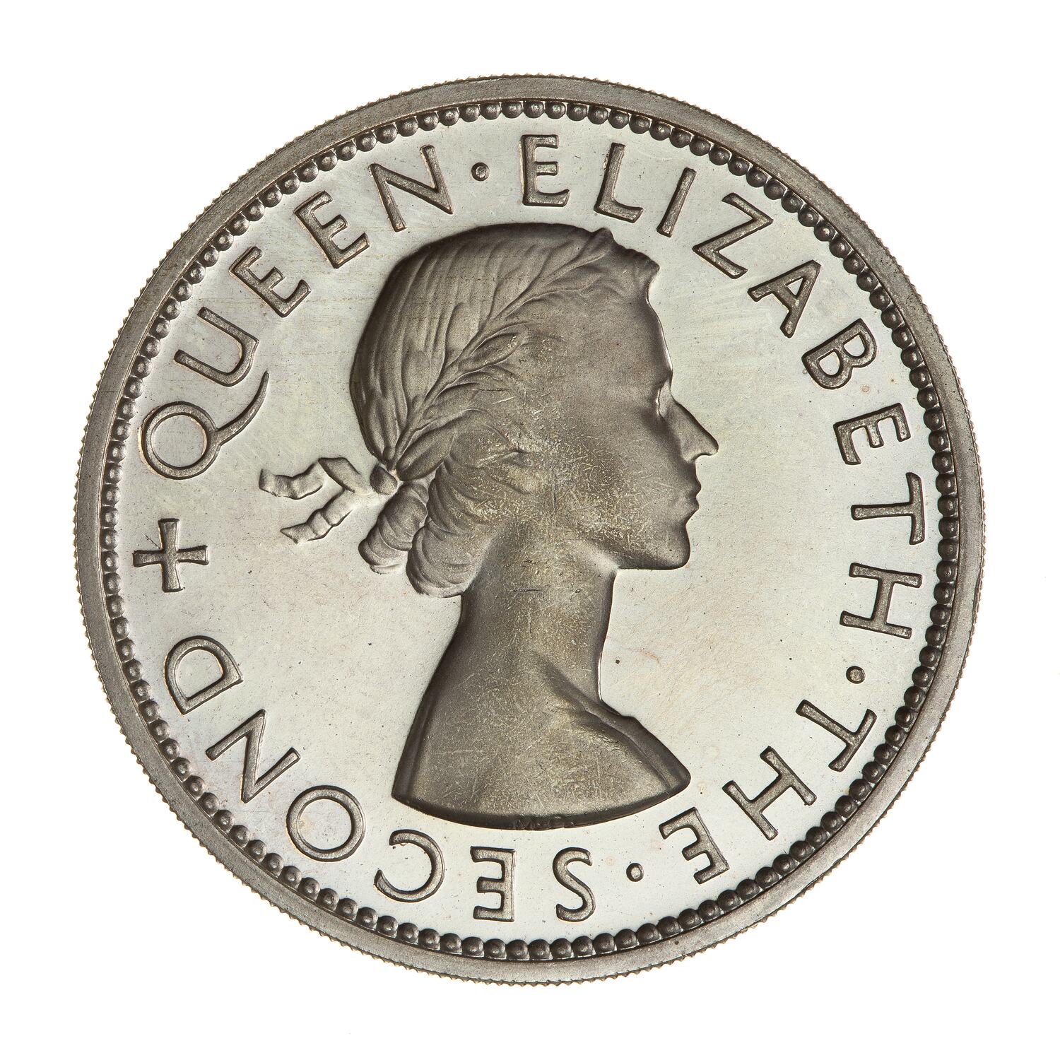 Laureate bust of the Queen facing right; around, QUEEN ELIZABETH THE SECOND; artist's initials, MG, incuse on bust truncation