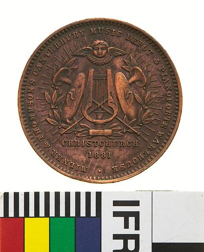 Obverse: MILNER & THOMPSON CANTERBURY MUSIC DEPOT & PIANOFORTE WAREHOUSE CHRISTCHURCH 1881 Reverse: NEW ZEALAND