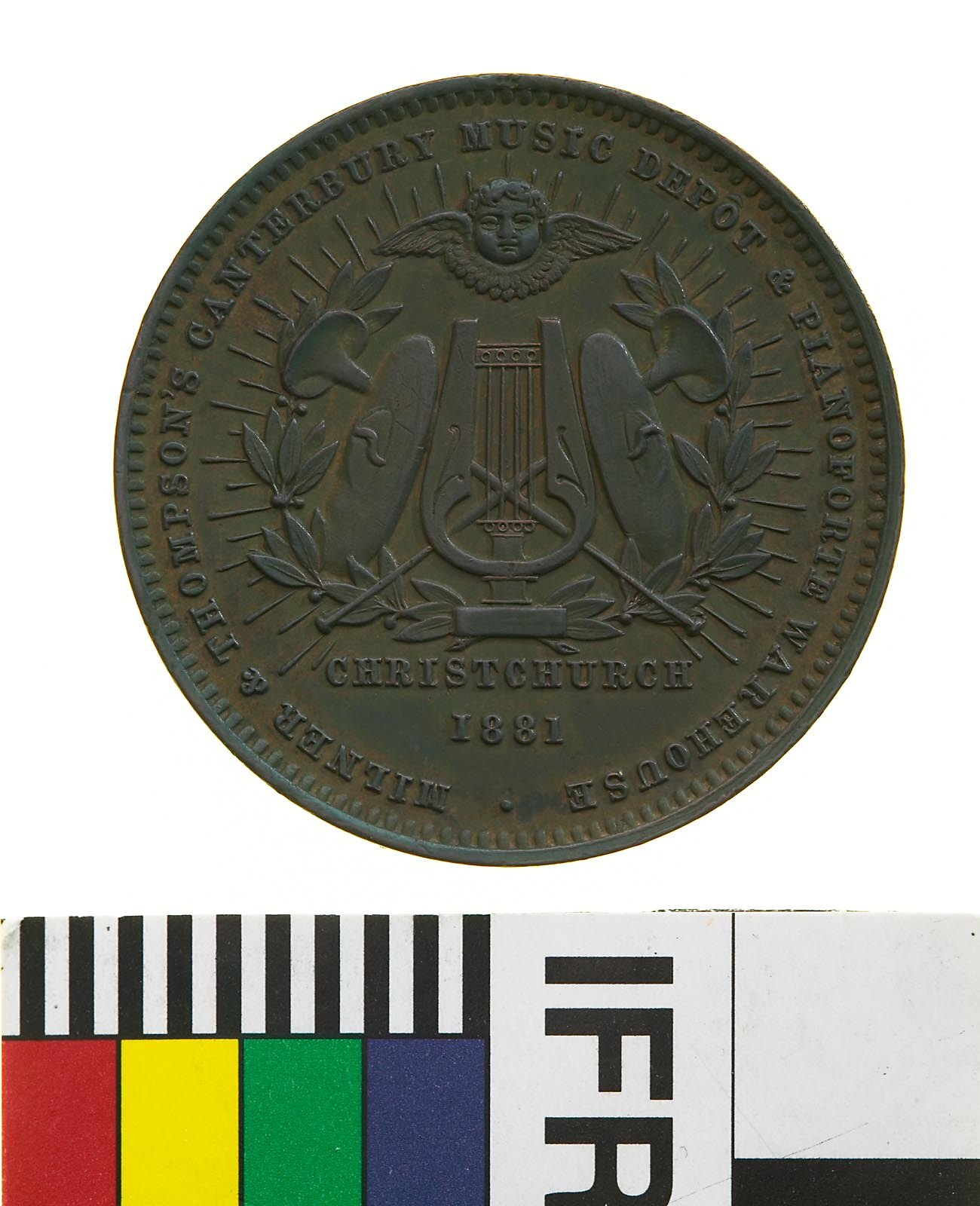 Obverse: MILNER & THOMPSON CANTERBURY MUSIC DEPOT & PIANOFORTE WAREHOUSE CHRISTCHURCH 1881 Reverse: NEW ZEALAND