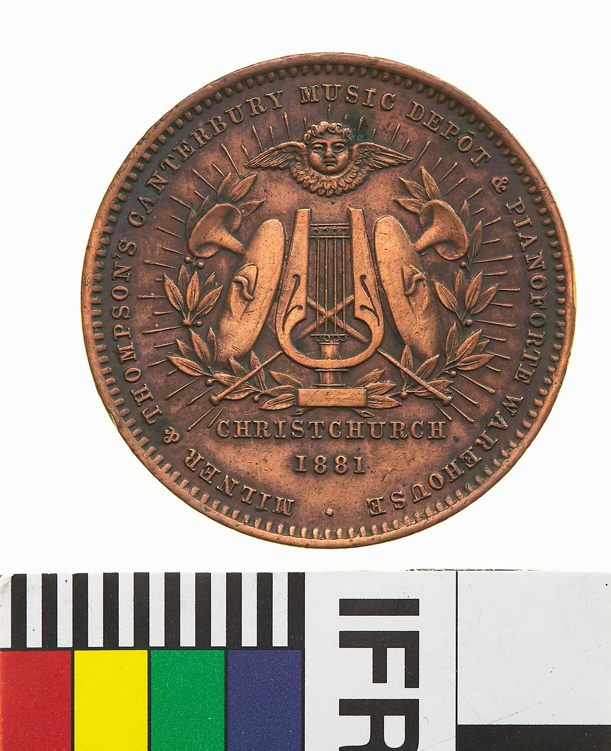 A round copper token (32 mm diameter). The token features the name and business of the issuer: Milner & Thompson, Canterbury Music Depot & Pianoforte Warehouse, Christchurch around a group of musical instruments set inside a radiate olive wreath with a winged cherub head set at the top. The reverse features an advertisment for the company holding the sole agency for John Brinsmead pianos. The reverse has toned green.