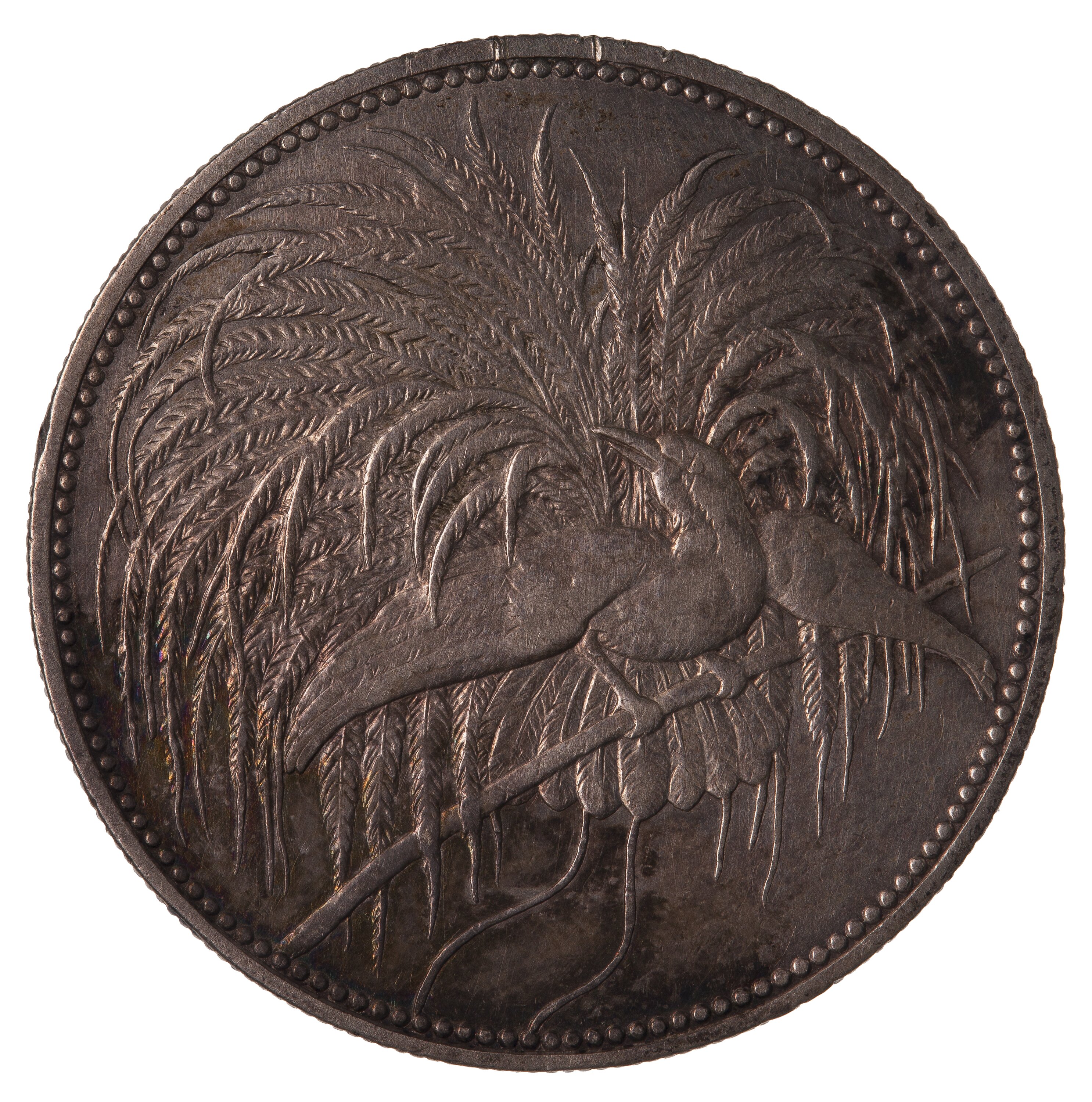 Silver 5 Marks coin issued by the German New Guinea Company. Struck at the Berlin mint, Germany. This coin was issued by the German New Guinea Company. This was a Chartered Company which had been formed in 1884 in Berlin to colonise and profit from north-eastern New Guinea. It had found it necessary to import workers from Java (who wanted payment in Dutch guilders), China and Japan (who wanted payment in Mexican dollars, a standard trad coin in Asia at that time). German, and to a lesser extent British coins was also in use in the area. To simplify this situation the Company sought permission to strike its own coins in 1891. Permission was not granted until 1894 with the stipulation that each denomination (excluding the bronze) was to match it's German Imperial equivalent. The coins were not however to bear the head of the German Emperor nor the German Eagle - they were the issue of the Company. The dies were prepared (engraved by Emil Weigand) and coins struck at the Berlin Mint. When they arrived in New Guinea all non German coins were withdrawn from circulation (the German 3 Mark and 20 Pfennig denominations were also excluded from circulation). No further production of coins was required as administration of the region was handed to the German Imperial Government in 1899, with German Imperial coins being imported. The Company coins ceased to be legal tender after 15 April 1911.