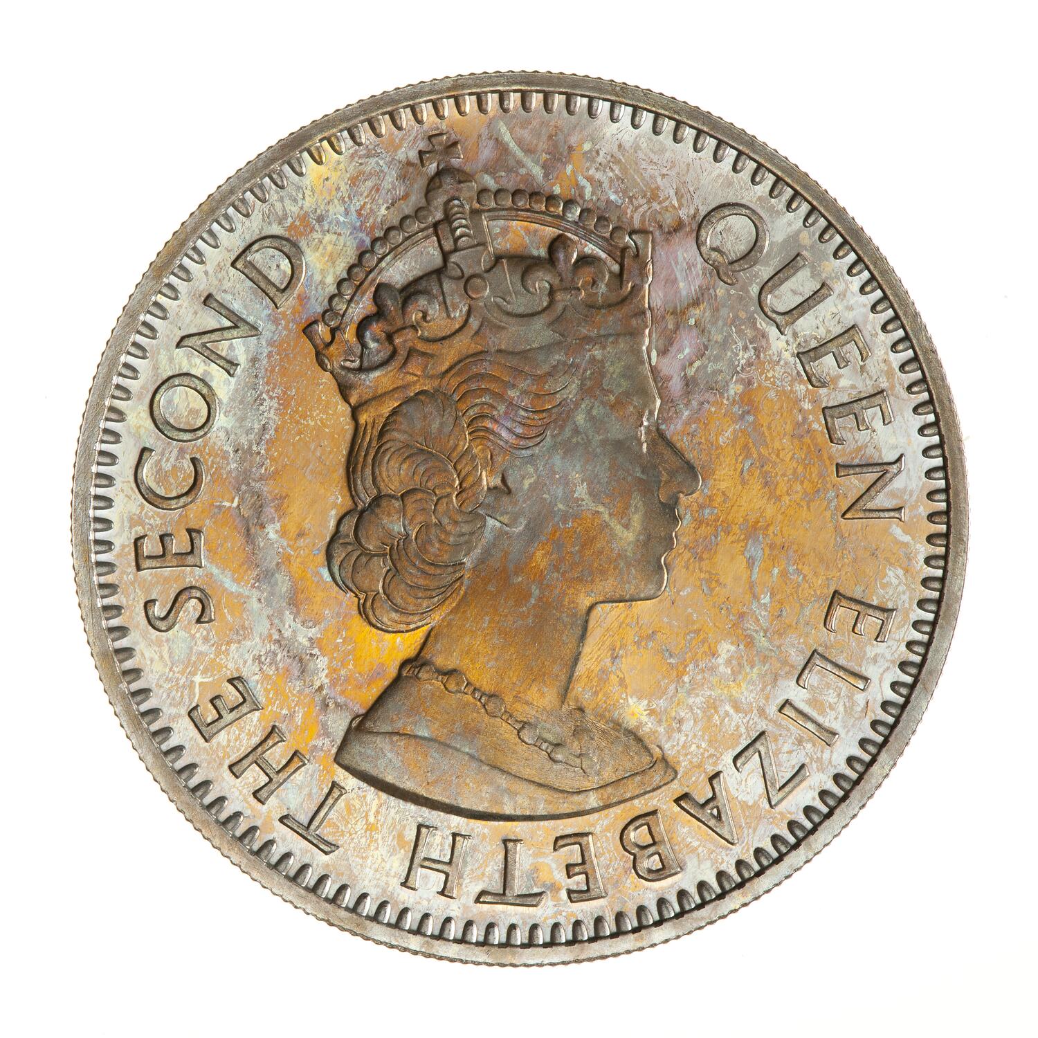 Crowned bust of the queen facing right; around, QUEEN ELIZABETH THE SECOND; artist's initials, CT, incuse on bust truncation