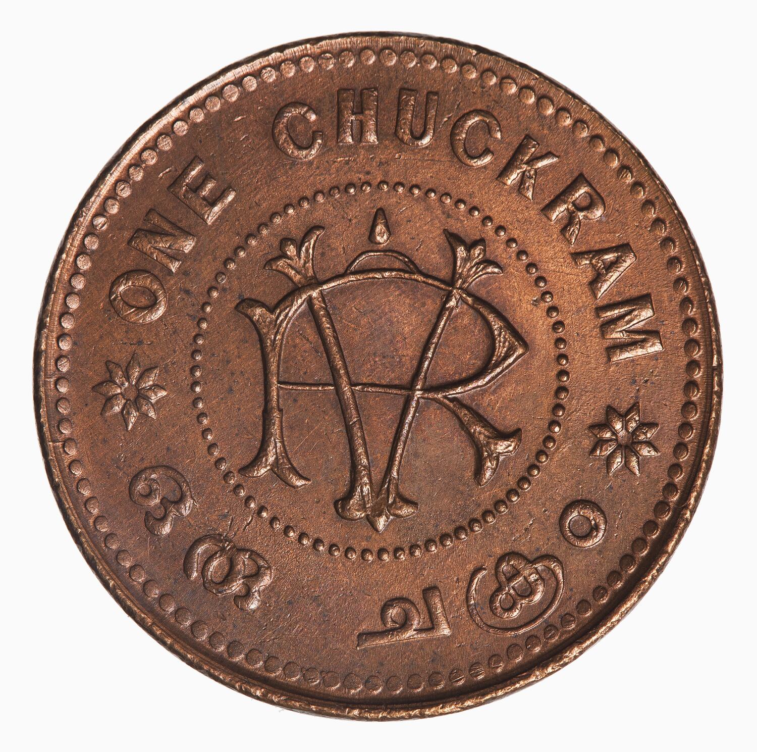 At centre within a circle of beads, the monogram RV (Rama Varma); around above, ONE CHUCKRAM; around below, legend