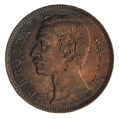 Sir Charles Johnson Brooke, depicted on the obverse of this coin, became Rajah of Sarawak after the death of James Brooke in 1868.