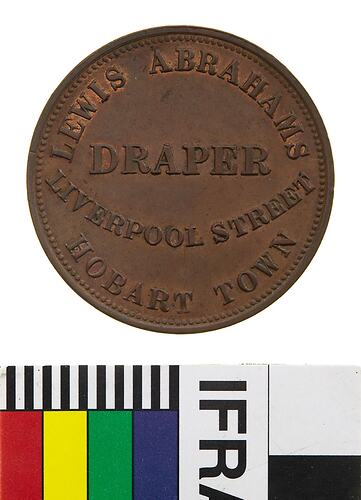Copper One Penny Token, minted by W.J. Taylor, London. Issued by Lewis Abrahams, Drapers, Hobart, Tasmania, 1855. Lewis Abrahams was certainly living in Hobart Town in 1835, records show that he was in partnership with a H.C. Davis in Liverpool Street. He was married in the Jewish Synagogue in December 1855. It appears that Davis withdrew from the partnership and Abrahams carried on alone. He died in Hobart in 1860. Abrahams is mentioned in a number of documents held by the Hobart Hebrew Congregation, he is listed as a contributor to the fund for the construction of the Hobart Synagogue in 1844-1845, and as a 'seatholder' (financial member) of the Hobart Hebrew Congregation.