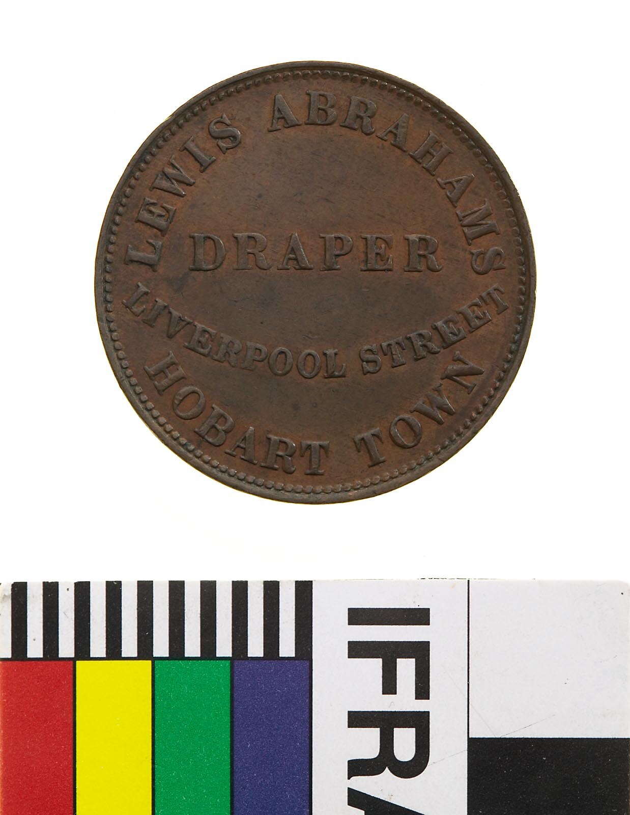 Copper Halfpenny Token, minted by W.J. Taylor, London. Issued by Lewis Abrahams, Drapers, Hobart, Tasmania, 1855. Lewis Abrahams was certainly living in Hobart Town in 1835, records show that he was in partnership with a H.C. Davis in Liverpool Street. He was married in the Jewish Synagogue in December 1855. It appears that Davis withdrew from the partnership and Abrahams carried on alone. He died in Hobart in 1860. Abrahams is mentioned in a number of documents held by the Hobart Hebrew Congregation, he is listed as a contributor to the fund for the construction of the Hobart Synagogue in 1844-1845, and as a 'seatholder' (financial member) of the Hobart Hebrew Congregation.
