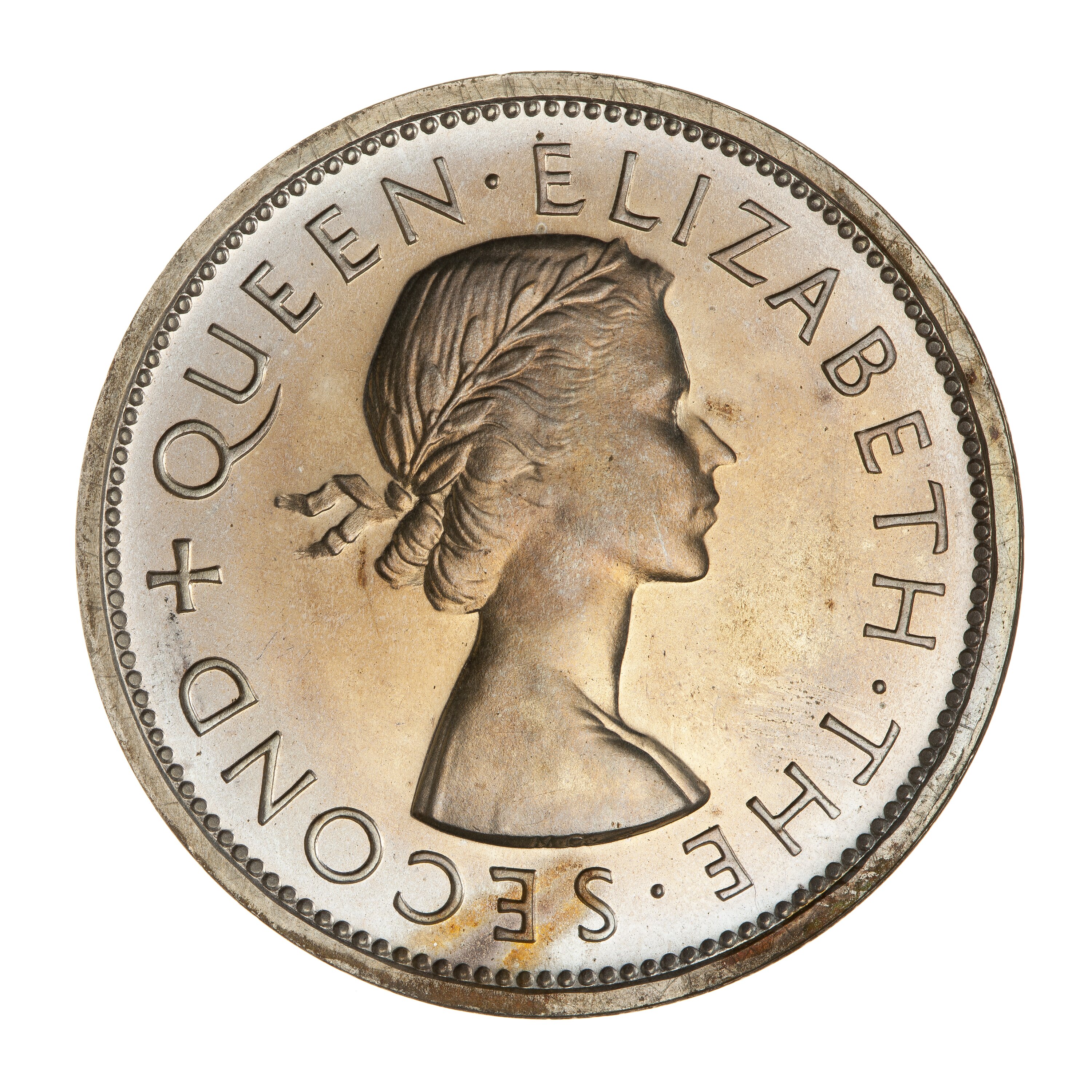Laureate bust of the Queen facing right; around, QUEEN ELIZABETH THE SECOND; artist's initials, MG, incuse on bust truncation