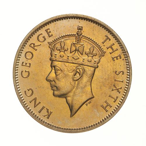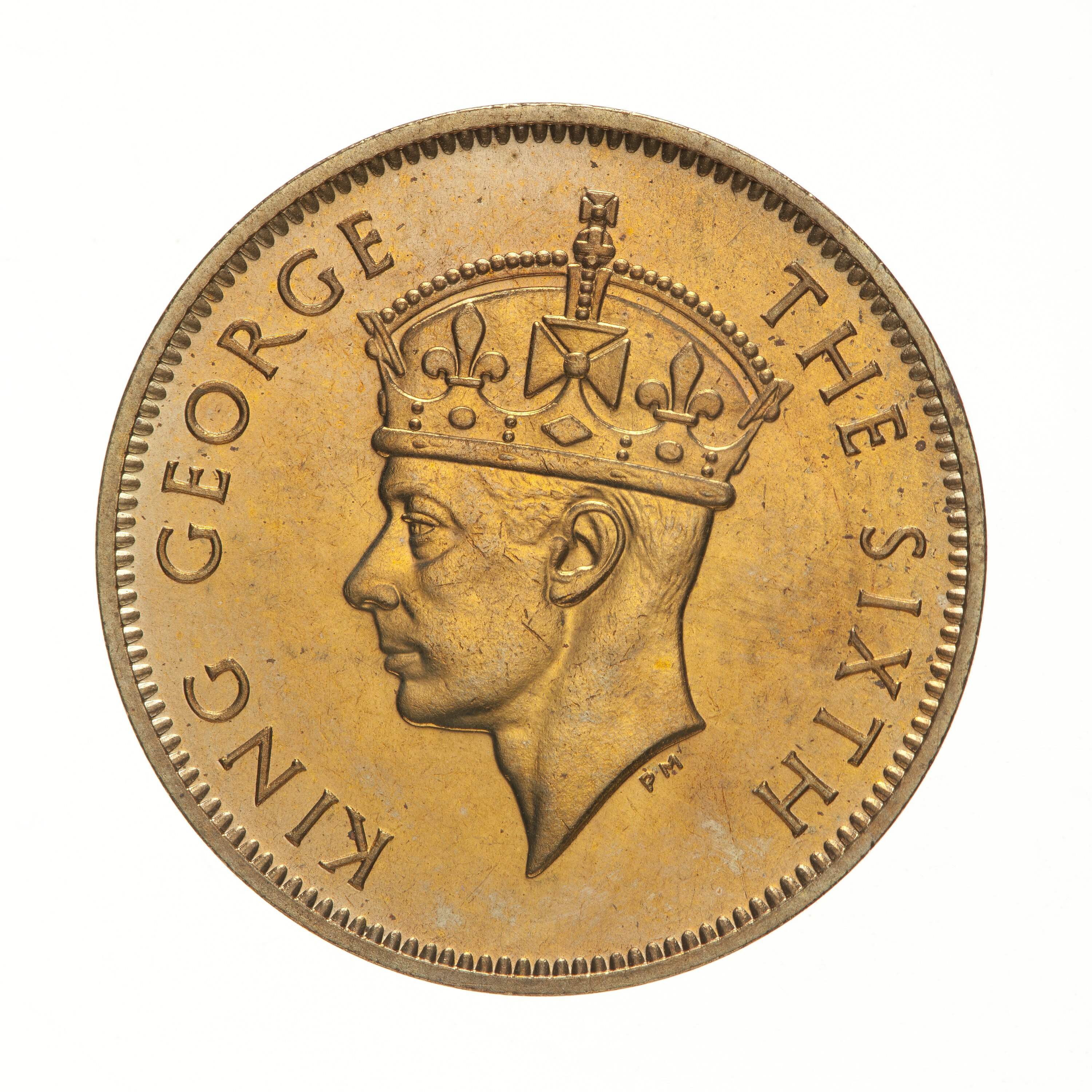 Crowned head of the King facing left; around, KING GEORGE THE SIXTH; below the neck truncation in small letters the artist's initials, PM
