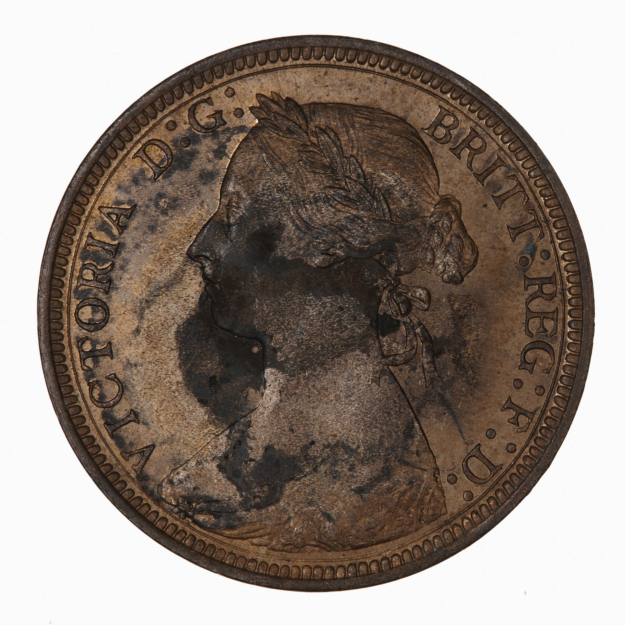 Bust of Queen Victoria facing left wearing bodice and a mantle decorated with rose, thistle and shamrock; in her hair a wreath of leaves and berries tied at back with ribbon, her hair drawn to a plaited bun behind, she wears a pearl brooch; around, VICTORIA D: G: BRITT: REG: F: D: