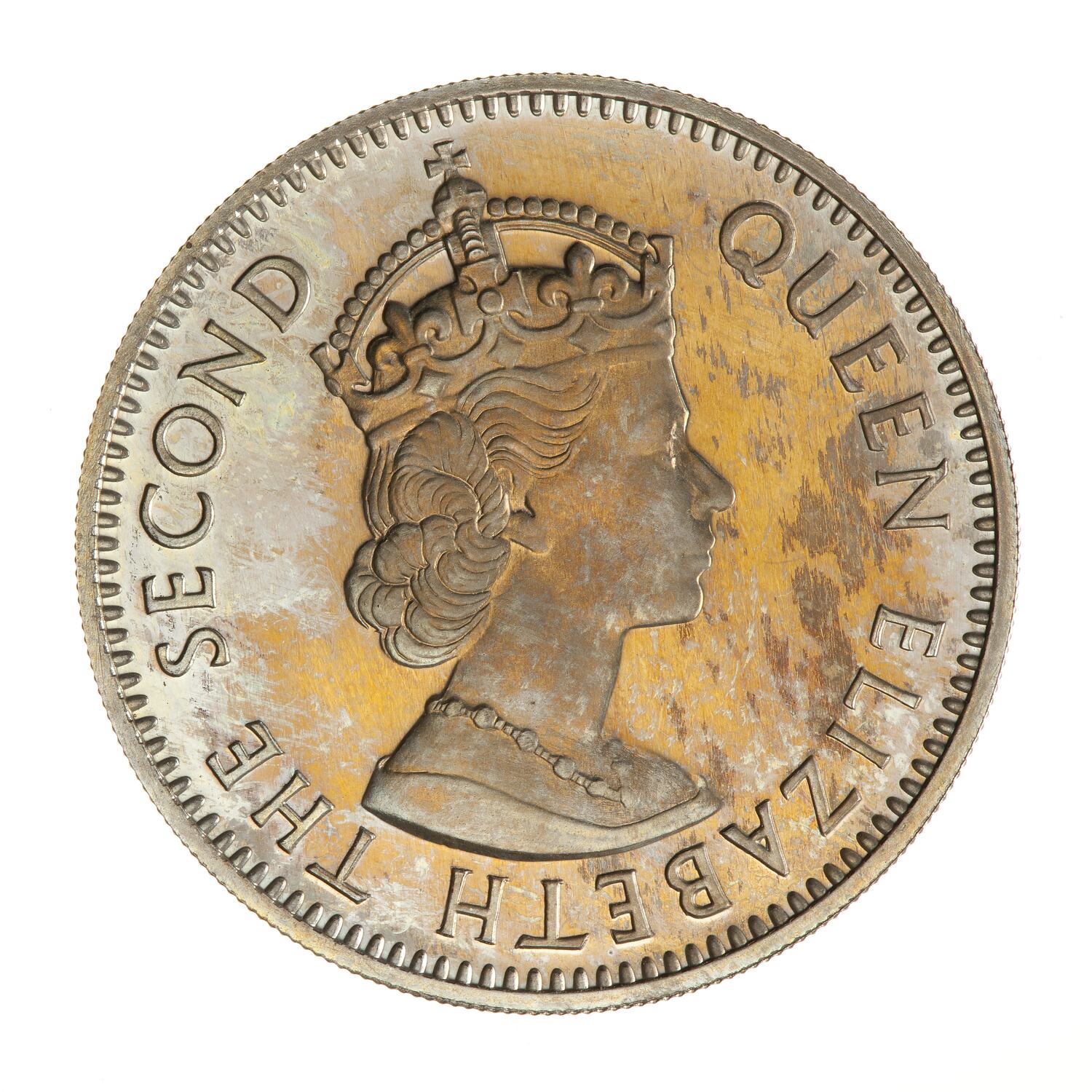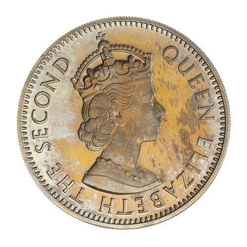 Crowned bust of the queen facing right; around, QUEEN ELIZABETH THE SECOND; artist's initials, CT, incuse on bust truncation