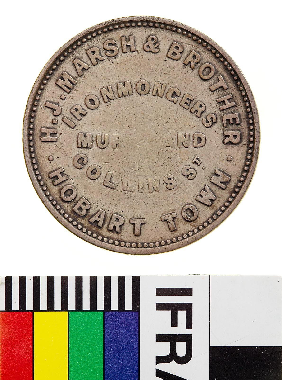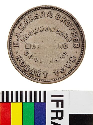 Legend in five lines, the first and last curved against the rim beads, H.J. MARSH & BROTHER / IRONMONGERS / MURRY AND / COLLINS ST. / HOBART TOWN