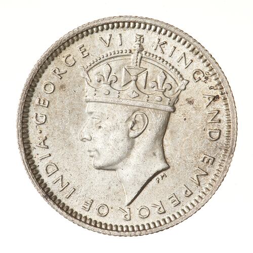 Crowned head of the King facing left; around, GEORGE VI KING AND EMPEROR OF INDIA; artist's initials, PM, below neck