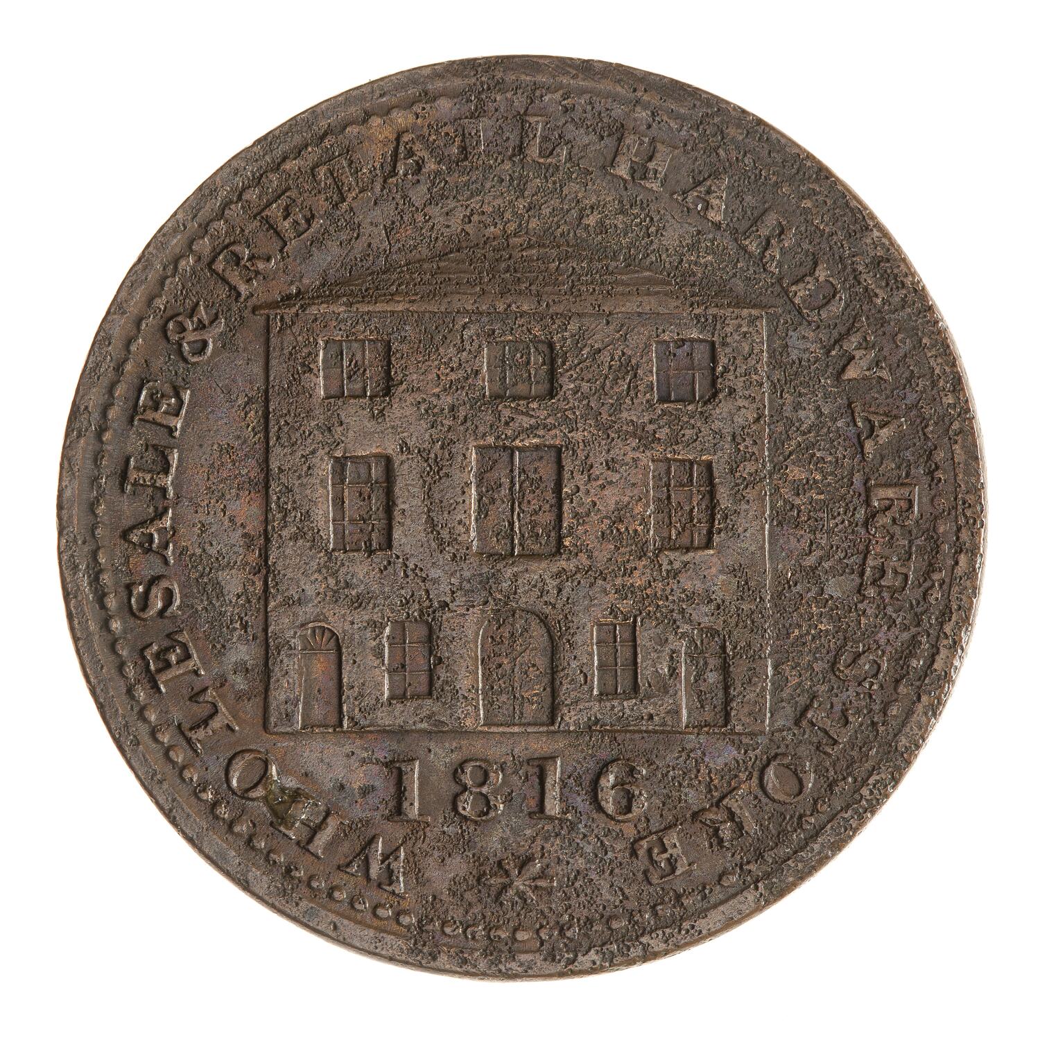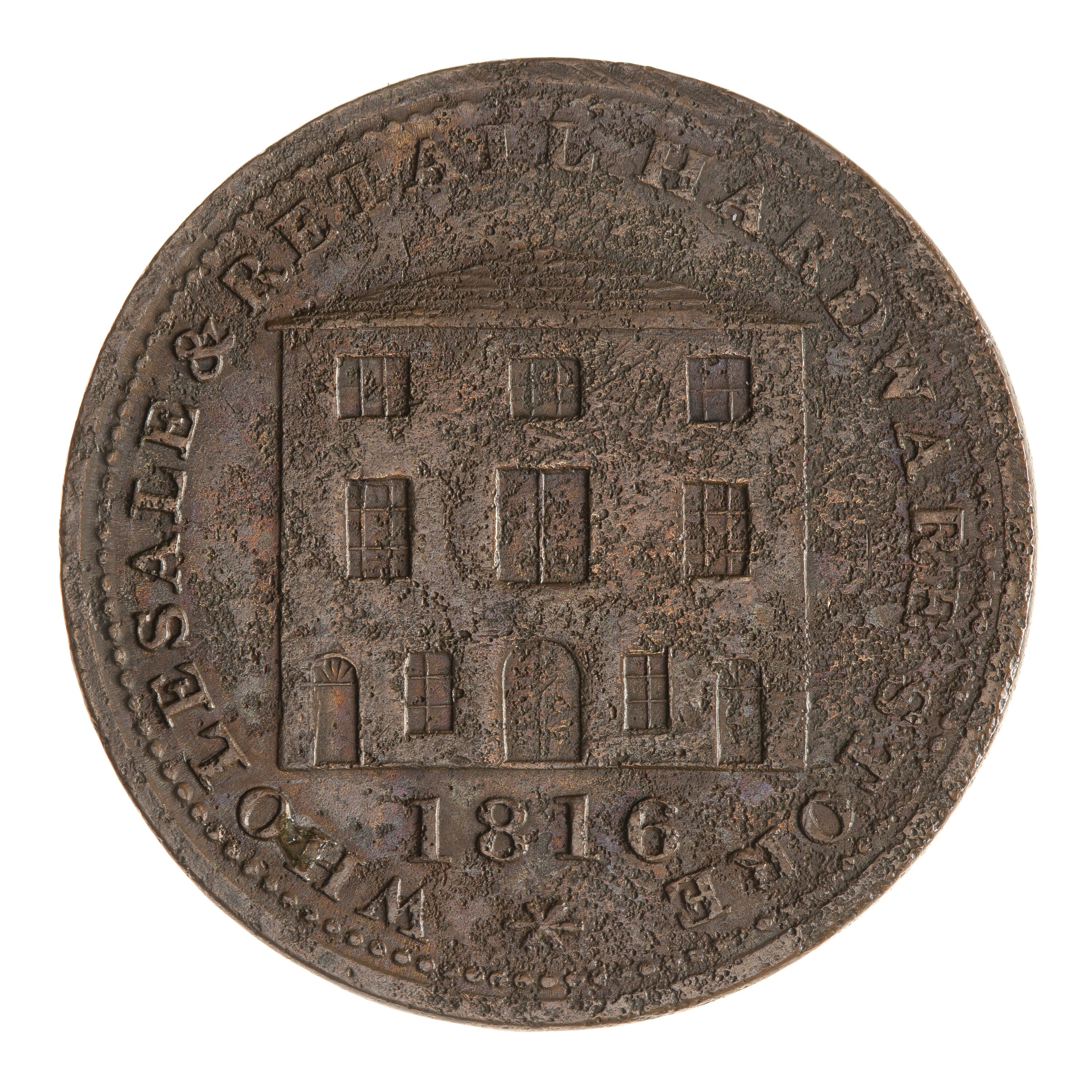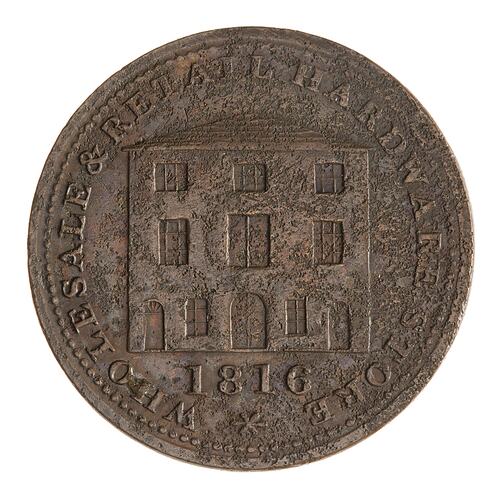 The hardware firm of W.A. & S. Black was established in Halifax in about 1812 and ended with the retirement of the last member of the Black family in 1871. The brother's full names were William Anderson (1788 - 1864) and Samuel; they were sons of the Rev. William Black a founder of Methodism in the Province. Two tokens were issued, one giving the name of the firm and a second (this type) with the same designs (the company storehouse and trade goods) but naming only Halifax, where the firm was established. William served in the Nova Scotia provincial legislature and was a lieutenant-colonel in the 4th Halifax Regiment.