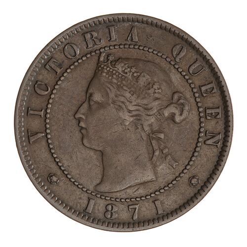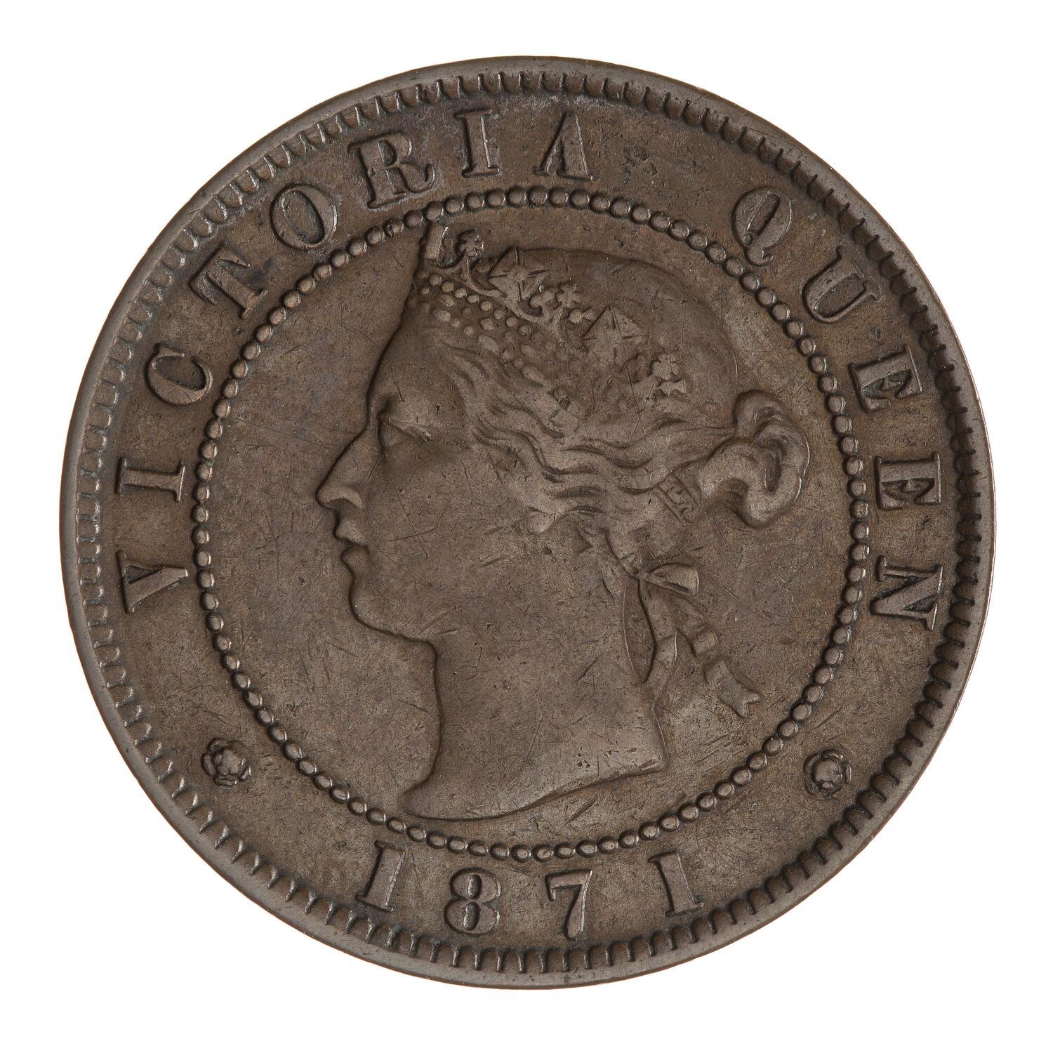 Within a beaded circle, diademed head of the Queen facing left; around, VICTORIA QUEEN 1871