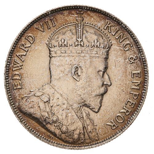 Crowned and draped bust of the King facing right, the King is wearing the Imperial Crown and the ermine Robe of State, the Collar of the Most Honourable Order of the Bath; around, EDWARD VII KING AND EMPEROR; below the bust truncation, the artist's initials, DES