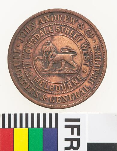 At centre, male lion standing to left with head crowned facing front, its right paw is raised and rests on a shield bearing the Union Jack, its tail curved back over its body. around in two concentric circles of text devided by a beaded circle * JOHN ANDREW & CO. * IMPORTERS & GENERAL DRAPERS / 11 LONSDALE STREET WEST * MELBOURNE * In small letters in the exergue below the lion, COARD LONDON