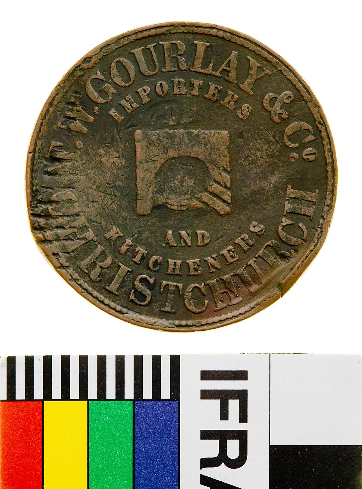 A round copper token (34 mm diameter). The piece features the name, address and business of the issuer: T.W. Gourlay & Co. Economy House High Street Christchurch, ironmongers. The obverse features a cast iron fireplace and the reverse a two-man timber saw. Heavy knocks to both sides.