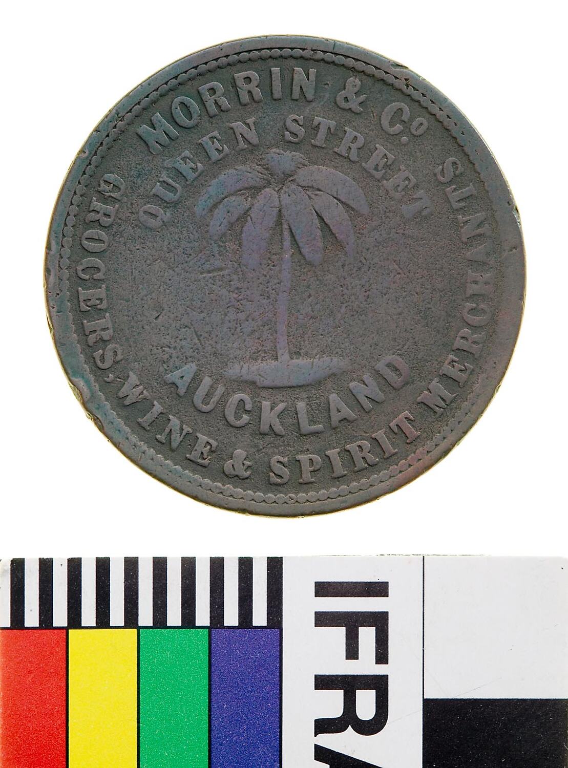 Obverse: MORRIN & Co. QUEEN STREET AUCKLAND GROCERS, WINE & SPIRIT MERCHANTS Reverse: ADVANCE AUCKLAND