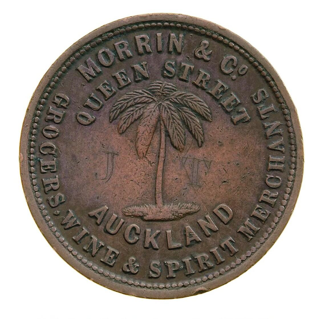 Obverse: MORRIN & Co. QUEEN STREET AUCKLAND GROCERS, WINE & SPIRIT MERCHANTS Reverse: ADVANCE AUCKLAND