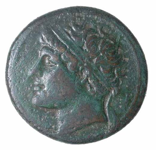 A copper coin issued by the city of Syracuse, Sicily, 275-215 BC. Minted by Syracuse. Hieron was a supporter of Pyrrhus but from 275 BC an independent commander of the Syracusan army. He won a number of victories and was proclaimed king; claiming descent from Gelon and Heiron I he became Hieron II.