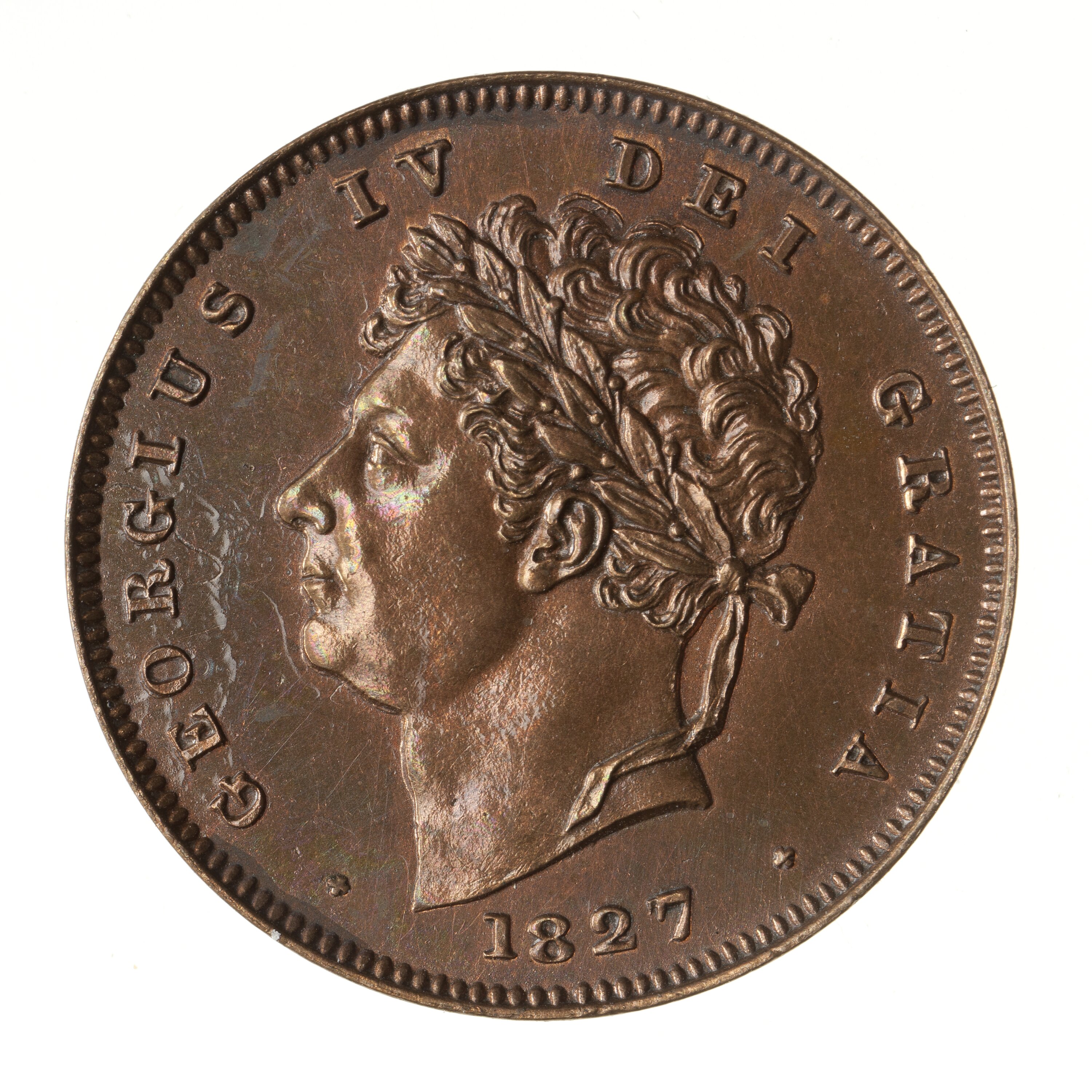 Laureate head of the king facing left; around, GEORGIUS IV DEI GRATIA + 1827 +