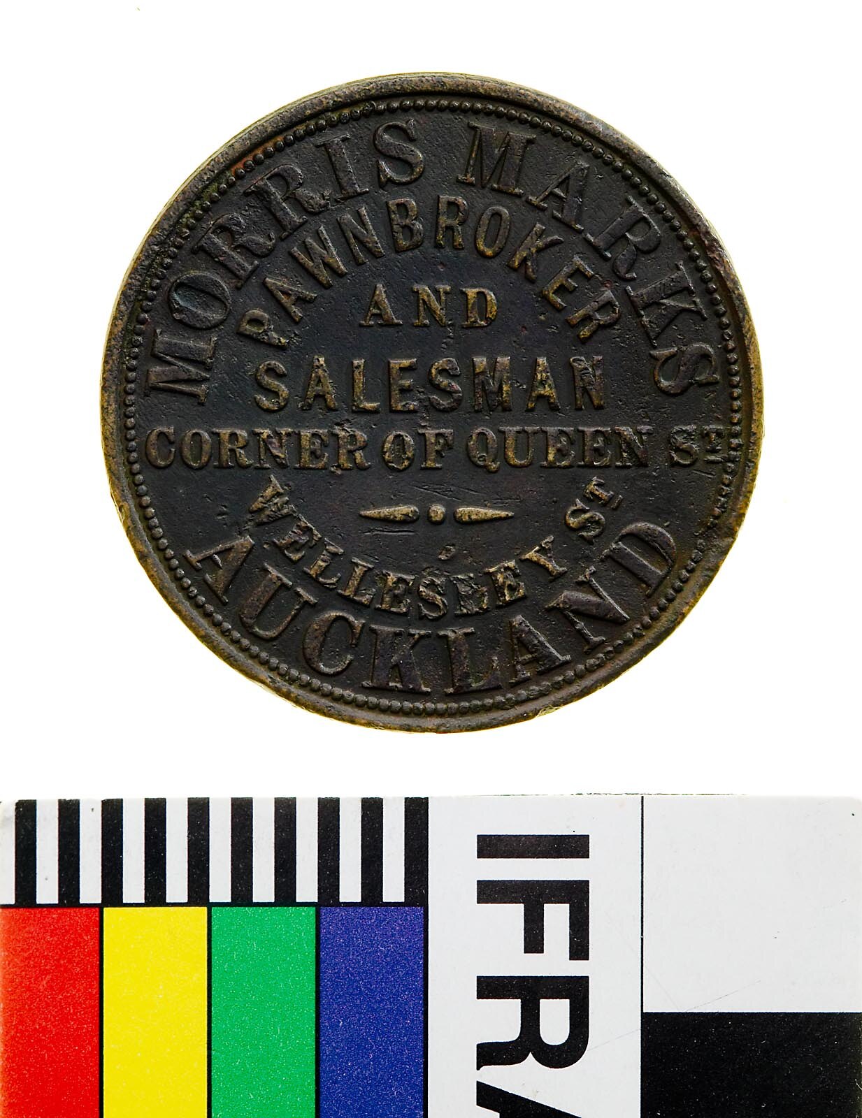 Obverse: MORRIS MARKS PAWNBROKER AND SALESMAN CORNER OF QUEEN ST. WELLINGTON ST. AUCKLAND