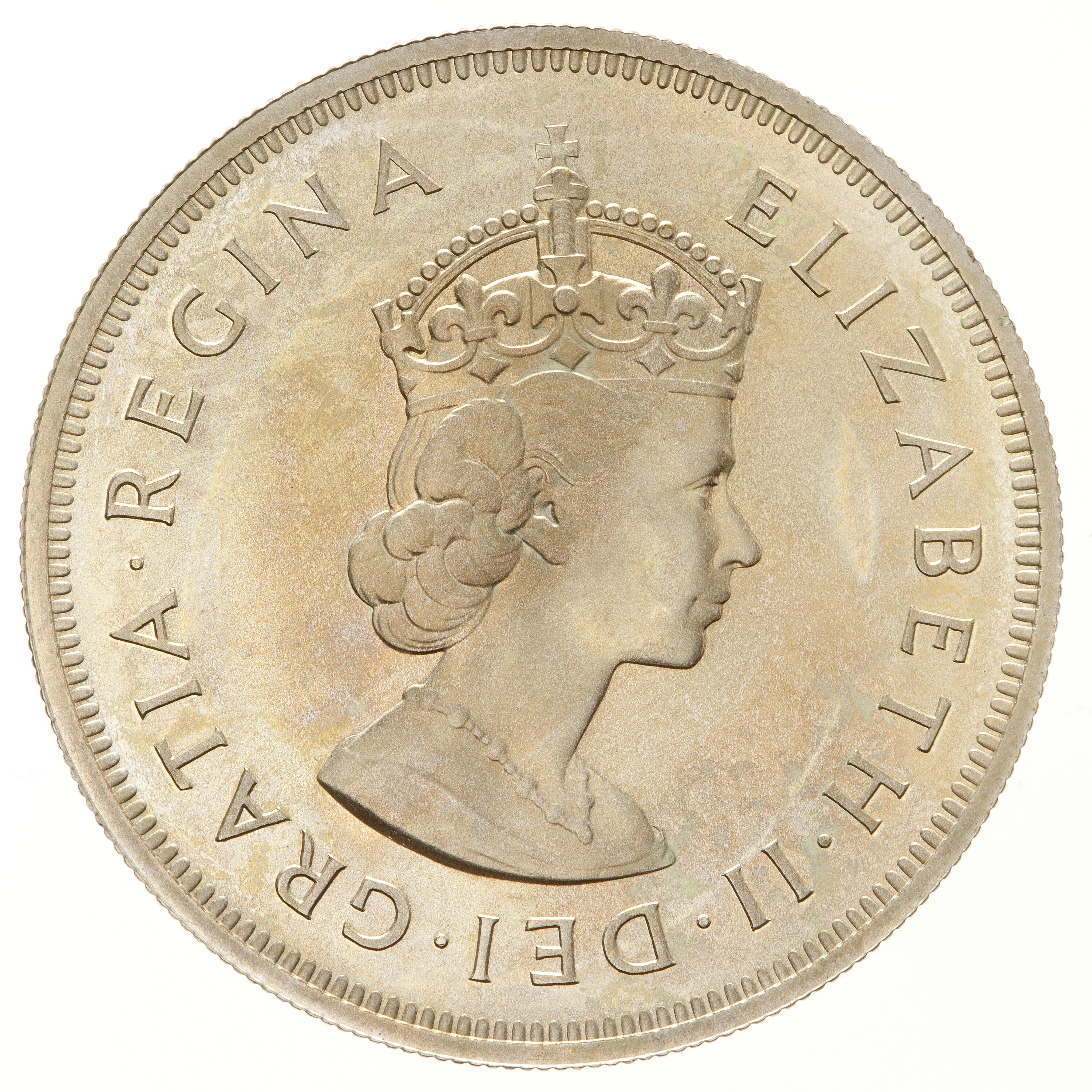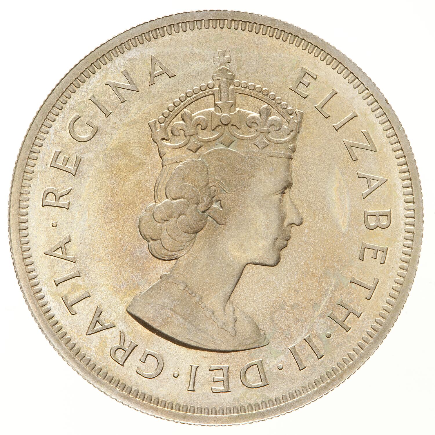 Crowned bust wearing necklace facing right; around, ELIZABETH II DEI GRATIA REGINA; inuse on the bust truncation the artist's initials, CT (Cecil Thomas)