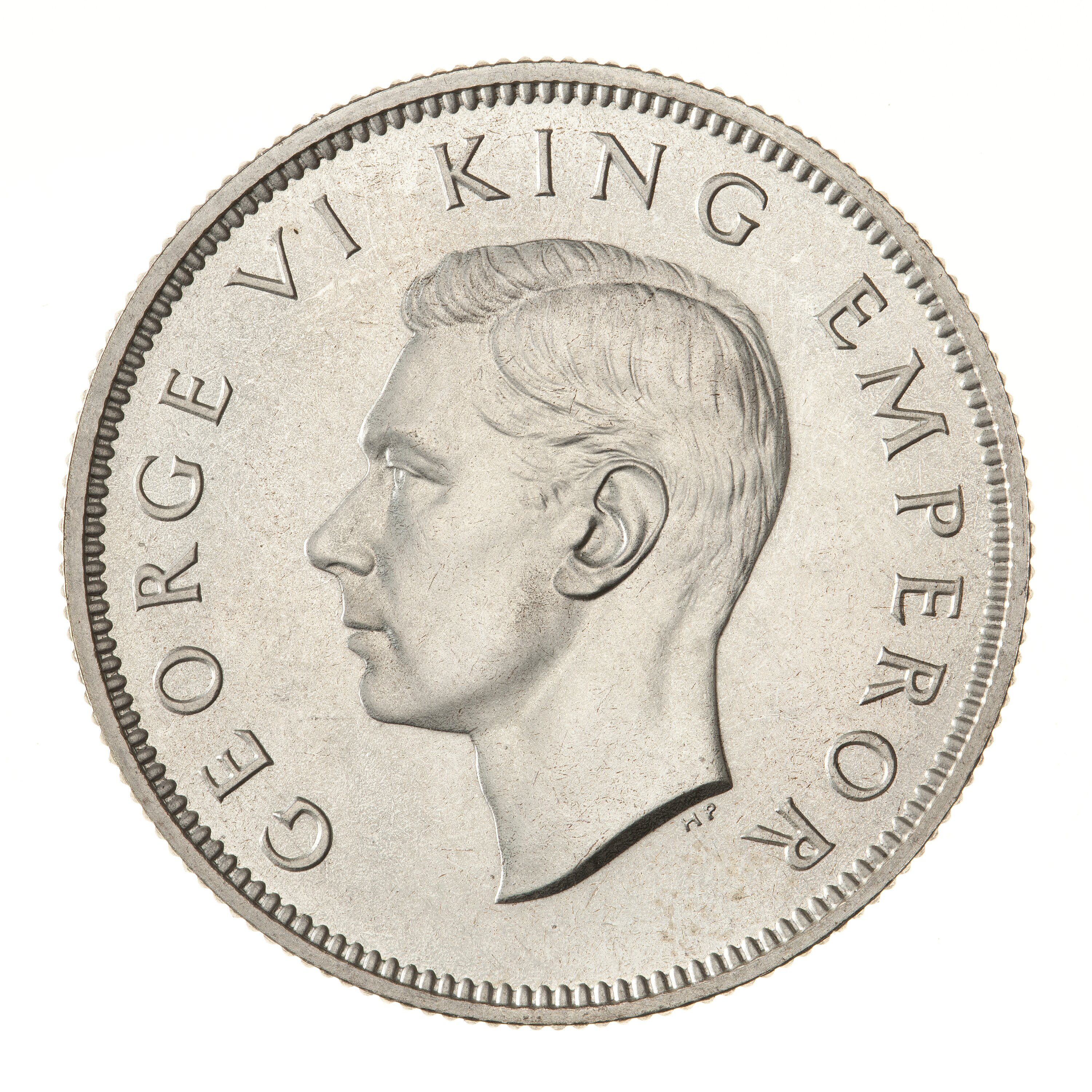 King's head, bare, facing left; around, GEORGE VI KING EMPEROR; below neck truncation in small letters the artist's initials HP ([Thomas] Humphrey Paget)