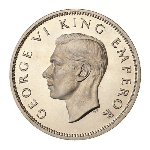 King's head, bare, facing left; around, GEORGE VI KING EMPEROR; below neck truncation in small letters the artist's initials HP ([Thomas] Humphrey Paget)