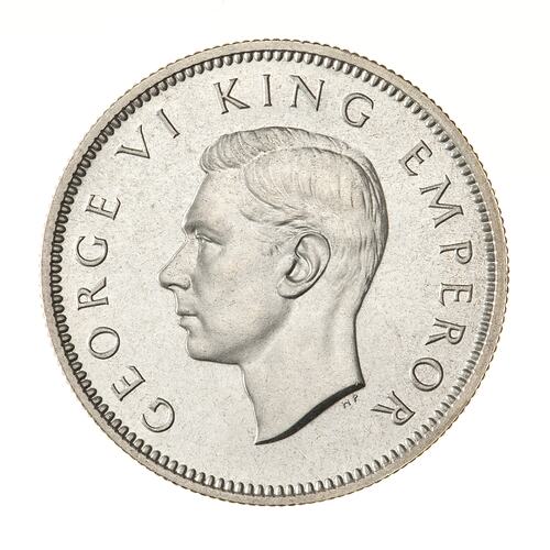 King's head, bare, facing left; around, GEORGE VI KING EMPEROR; below neck truncation in small letters the artist's initials HP ([Thomas] Humphrey Paget)