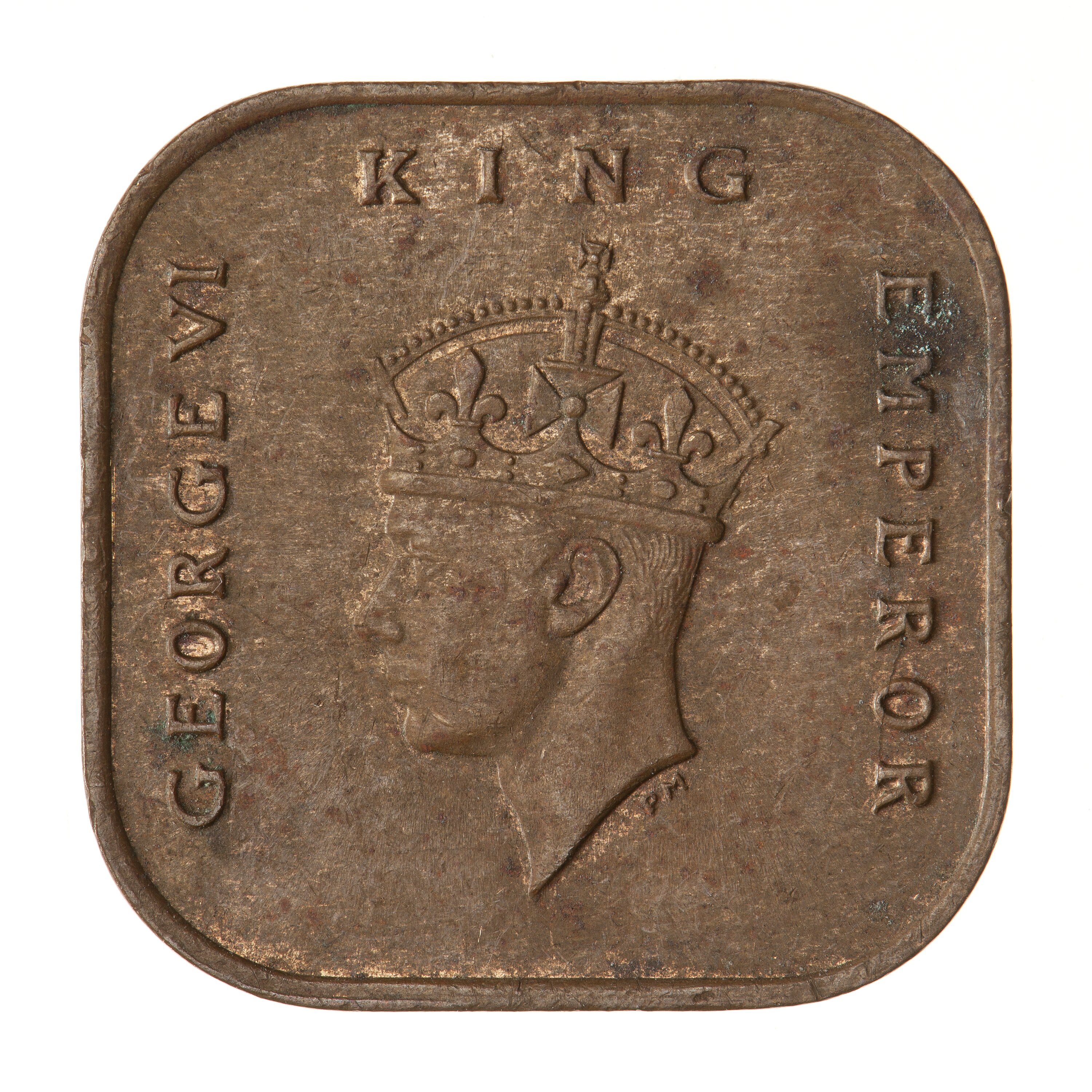 Crowned head of the King facing left; around, GEORGE VI KING EMPEROR; artist's initials, PM, below neck