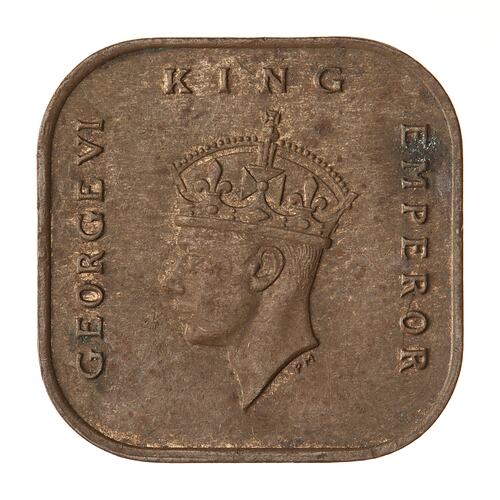 The British Government established the Malay Planning Unit in London in 1943 to prepare for the return to Civil Government to the area after the Japanese invasion force was removed. One of the steps it took was to have the Royal Mint strike coins, ready for placement in circulation soon after the return (the Japanese issued no coinage, relying on paper money). The coins were struck in London in 1943 and 1944 but all with the date 1943. They stock-piled in London until Malaya was placed under British Military Administration in August 1945 when the coins were soon put into circulation and a new issue, of which this coin was a part, bearing the date 1945 was begun.