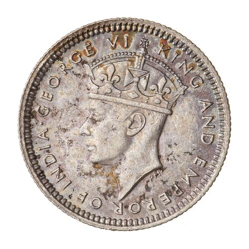 Crowned head of the King facing left; around, GEORGE VI KING AND EMPEROR OF INDIA; artist's initials, PM, below neck