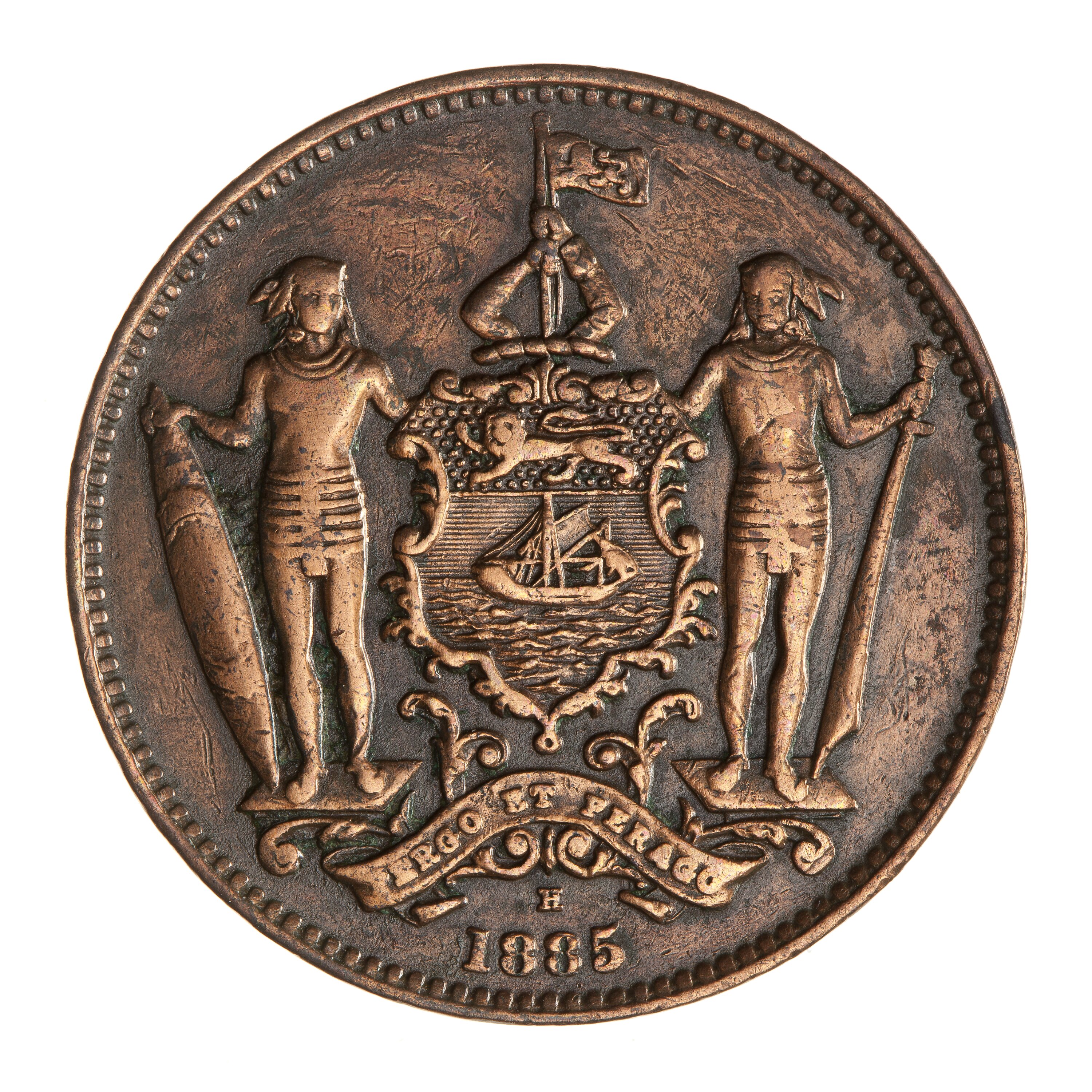 Shield of arms of the British North Borneo Company; on shield, a lion above a dhow; native warrior supporters one holding a shield the other as large machete; the crest, two arms holding a flag staff; below on ribbon the motto PERGO ET PERAGO (translation: I undertake and I achieve); below, 1885; the mint mark, H, above the date