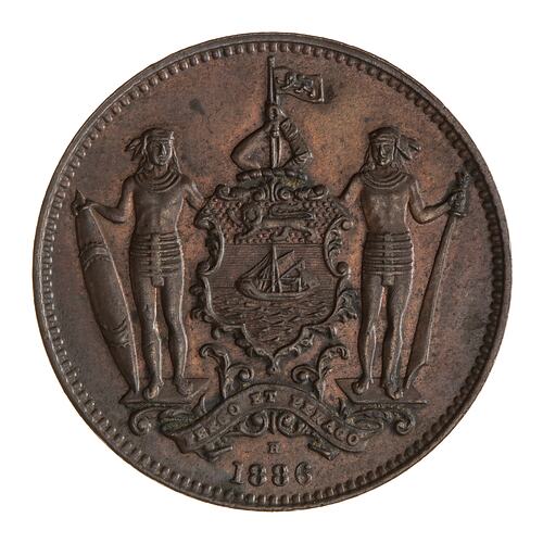 Shield of arms of the British North Borneo Company; on shield, a lion above a dhow; native warrior supporters one holding a shield the other as large machete; the crest, two arms holding a flag staff; below on ribbon the motto PERGO ET PERAGO (translation: I undertake and I achieve); below, 1886; the mint mark, H, above the date