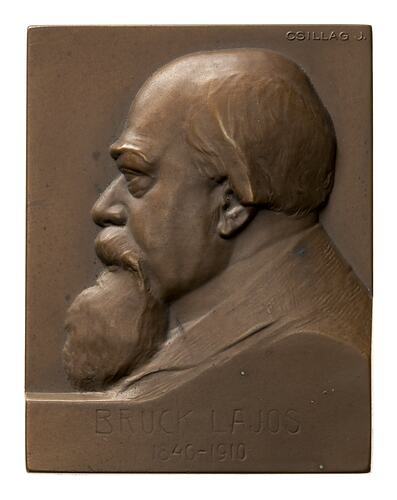 Rectangular bronze plaque. The obverse depicts the draped bust of Lajos Bruck, facing left. Inscription below. Artist's name top right border.