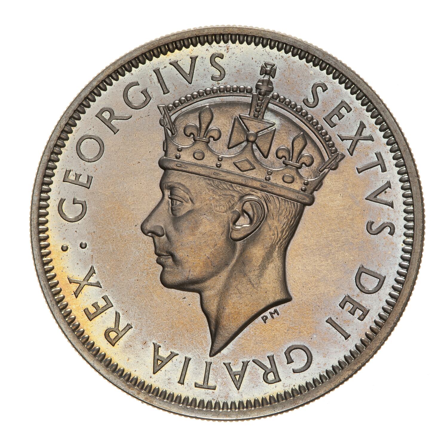 Crowned head of George VI facing left; around, GEORGIVS VI DEI GRATIA REX:; the artist's initials, PM, below the neck truncation