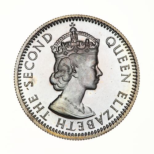 Crowned bust of Elizabeth II right; around, QUEEN ELIZABETH THE SECOND, the artist's initials, CT, incuse on neck truncation