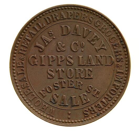 Obverse: JAS. DAVEY & CO. GIPPSLAND STORE FOSTER ST. SALE WHOLESALE & RETAIL DRAPERS GROCERS & IMPORTERS Reverse: VICTORIA . 1862 ADVANCE VICTORIA T. STOKES MAKER 100 COLLINS ST. EAST MELBOURNE.