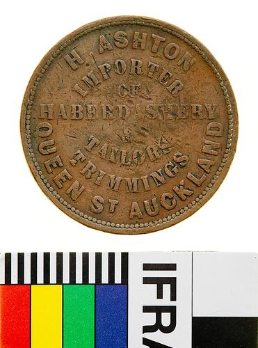 Obverse: H.ASHTON IMPORTER OF HABERDASHERY & TAILORS TRIMMINGS QUEEN ST. AUCKLAND Reverse: NEW ZEALAND 1863
