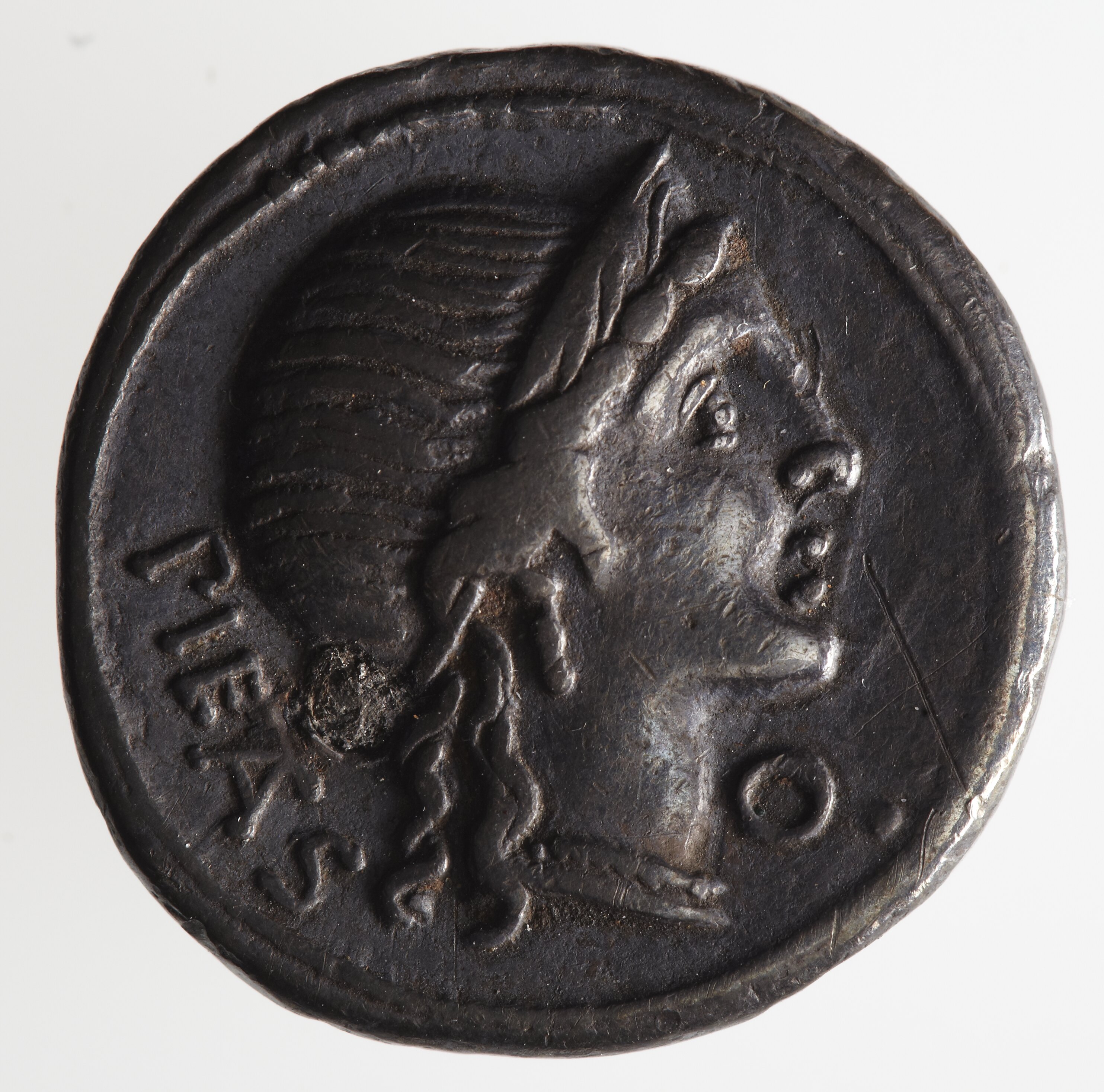 One of the Catanean brothers, Amphinomus or Anapis, running to right carrying their father on his shoulder; behind, M. HERENNI (the coin has been holed and plugged below the father's foot)