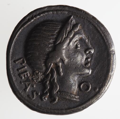 Head of Pietas wearing diadem facing right; behind, PIETAS; in field at right the control mark, O.