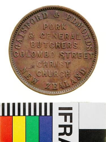 A round copper token (34 mm diameter). The piece features the name, address and business of the issuer: Gaisford & Edmonds, Colombo St. Christchurch, pork and general butchers The reverse features a female figure representing Justice seated on a wool bale with legs to left but her head and upper body to front. A wine barrel lies on the ground behind her and a three-masted sailing ship sails to the right on the horizon to the left. She wears a blindfold and extends a balanced set of scales with her right hand. With her left she holds an inverted cornucopia from which fruits flow onto the ground. She wears an ancient-style of flowing dress bound at the waist, both arms bare.