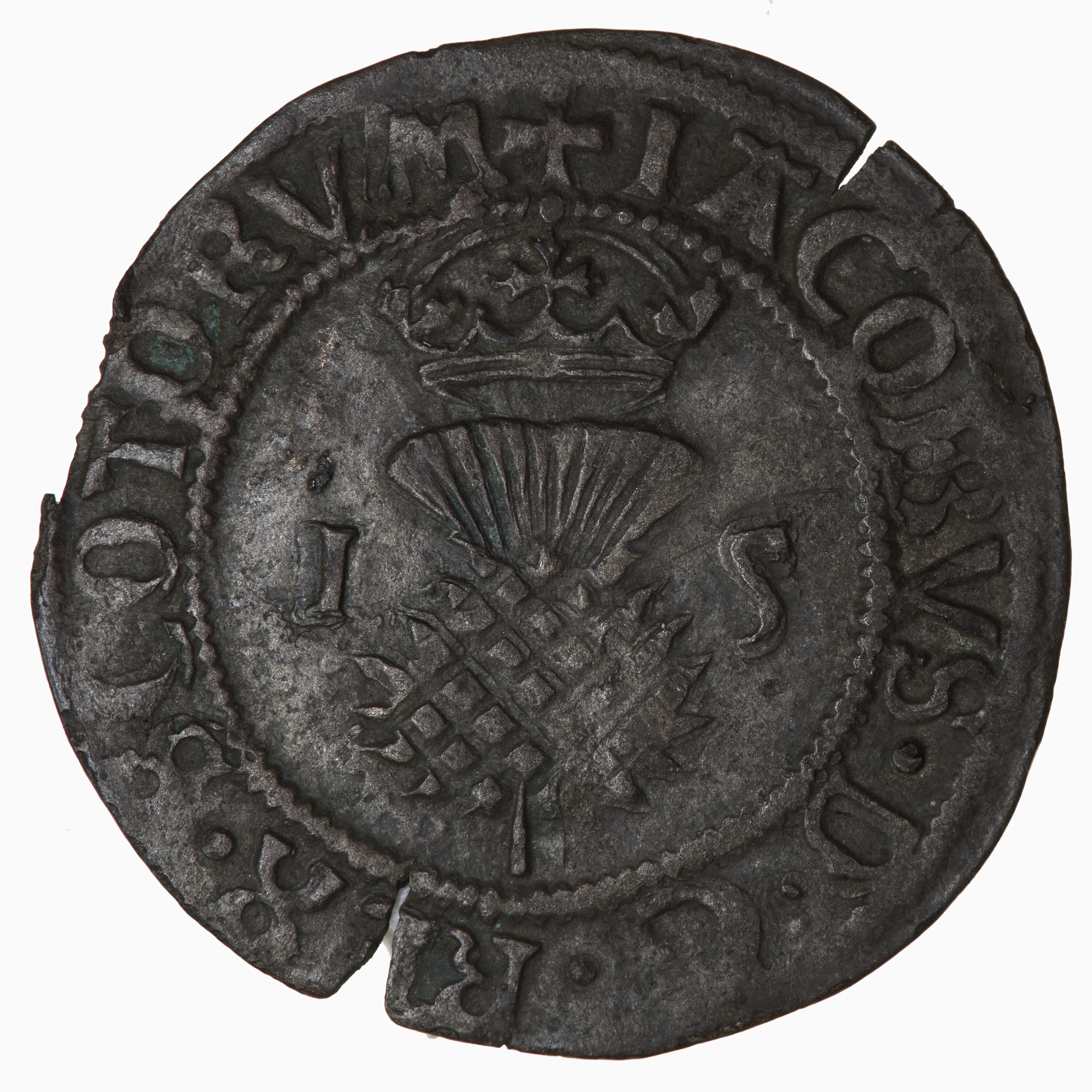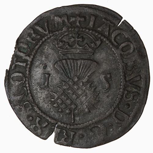 At centre within a line circle, crowned thistle with I 5 (James V) on sides; around, + IACOBVS D G REX SCOTORVM