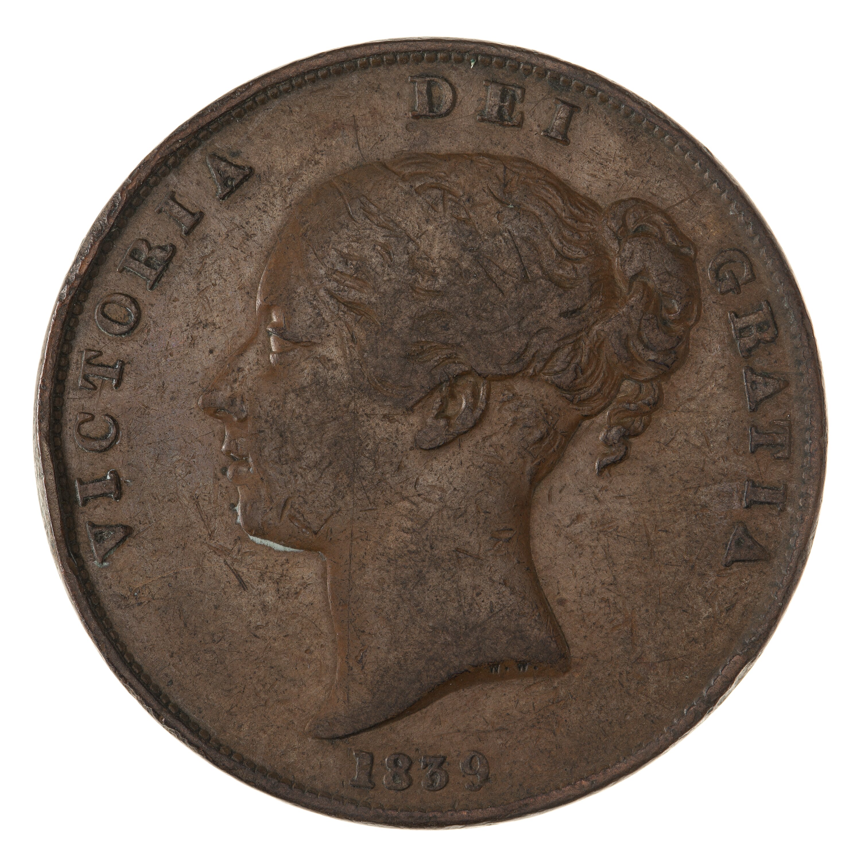 Head of Victoria facing left, plain bands in hair; the artist's initials W.W. incuse on neck truncation; below, 1839; around above, VICTORIA DEI GRATIA