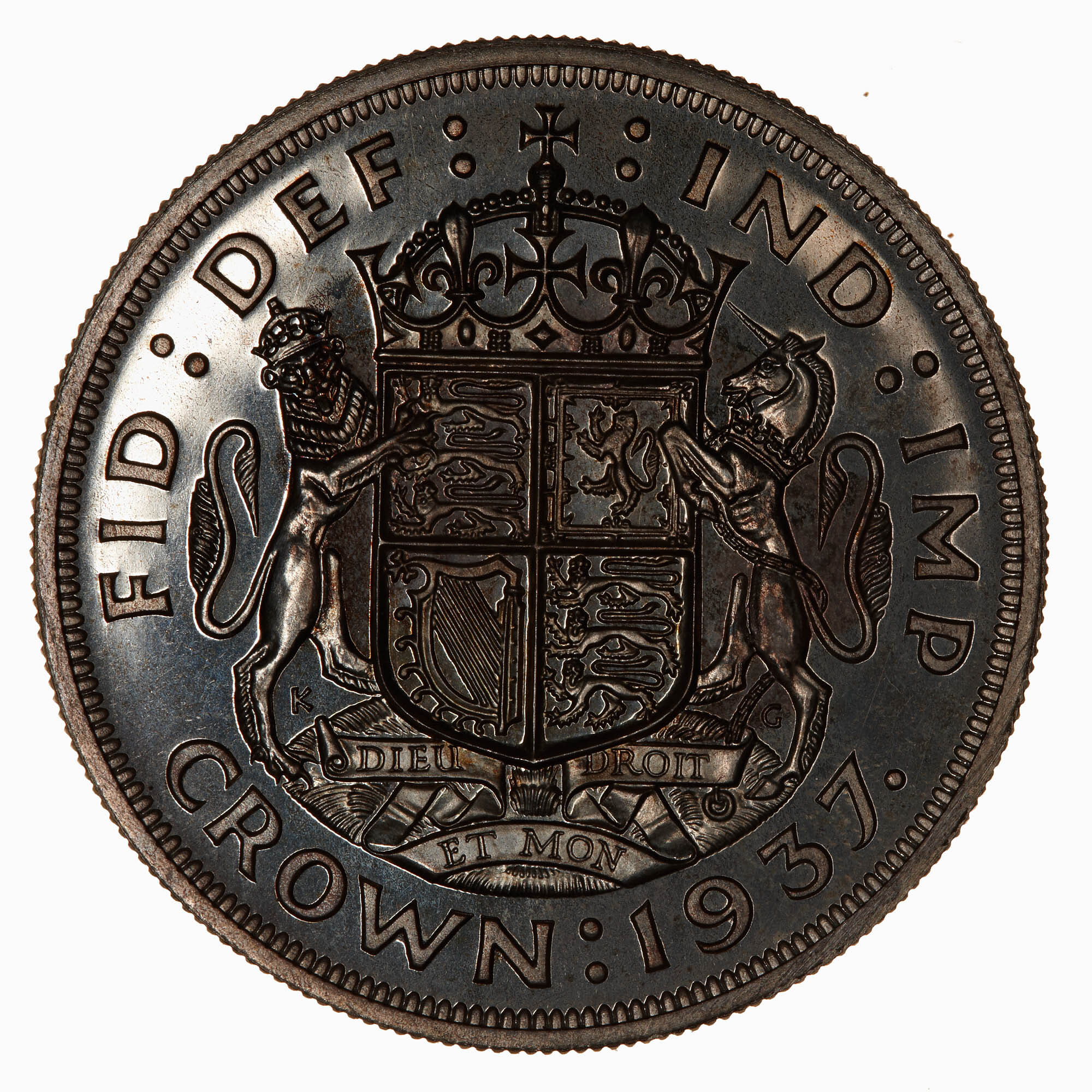 Crowned flat topped shield quartered with the arms of England (1 & 4), Scotland (2) and Ireland (3) supported by lion and unicorn; below, incuse on ribbon, DIEU ET MON DROIT; below supporters and divided by the shield, KG (G. Kruger Gray); around above, FID: DEF: IND: IMP:; around below, CROWN : 1937 .
