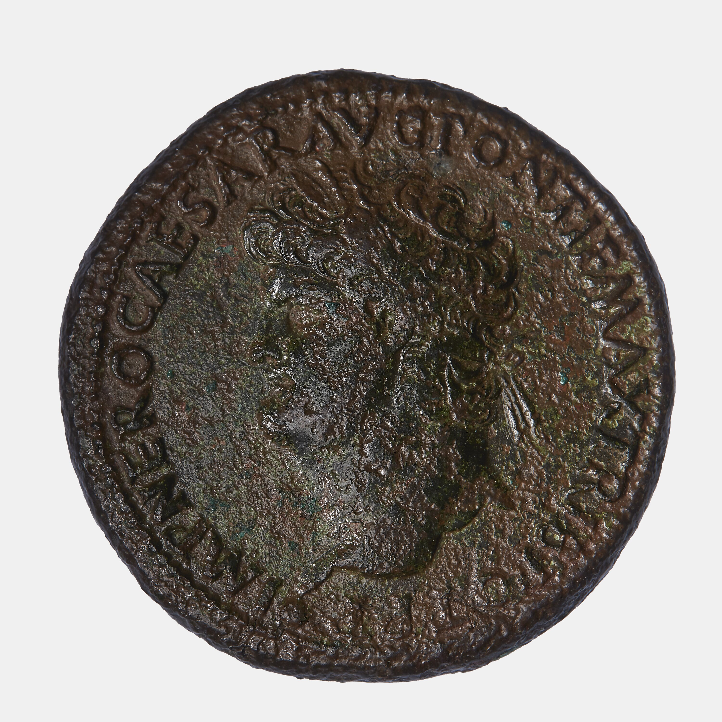 Orichalcum Sestertius struck during the reign of the Emperor Nero between 54 and 68 AD, probably in about 66, Ancient Roman Empire. Minted by Lugdunum. Sutherland (RIC p.180) places this issue in his Issue IV from Lugdunum, the mint being marked by the small globe at the point of the neck truncation on the coin's obverse. He associates this issue with Issue V from the Rome mint and suggests the date circa 66 AD.