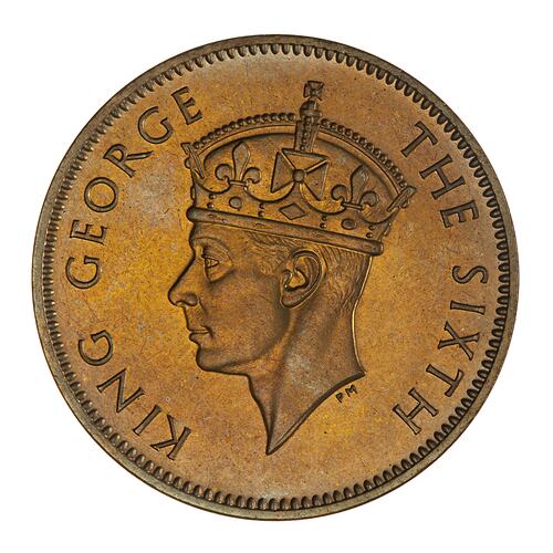 A crowned head of the King facing left; around, KING GEORGE THE SIXTH; below head the artist's initials, PM